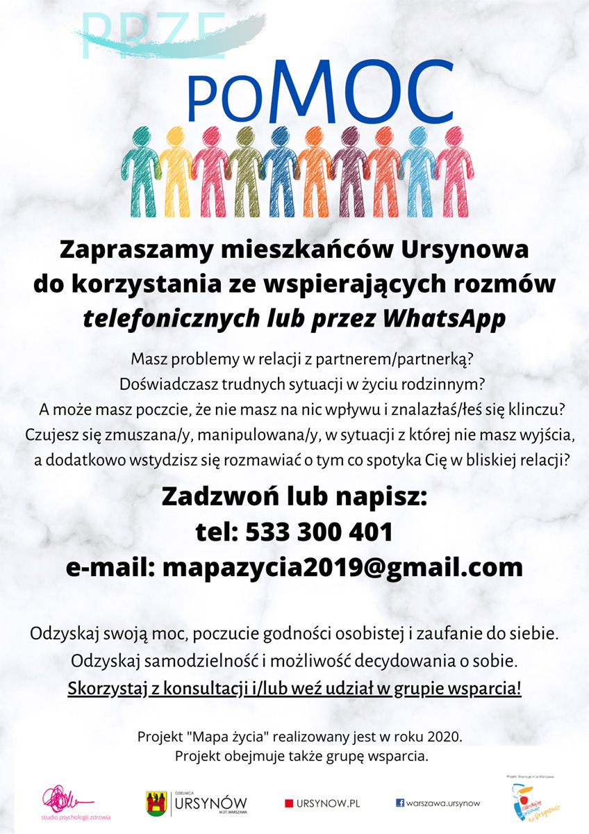 „Mapa życia” to kompleksowy projekt, którego celem jest zapewnienie wsparcia mieszkańcom Ursynowa dotkniętym zjawiskiem przemocy w rodzinie, przekazanie i rozpowszechnienie wiedzy na temat dostępnych form pomocy na terenie dzielnicy i m.st. Warszawy.